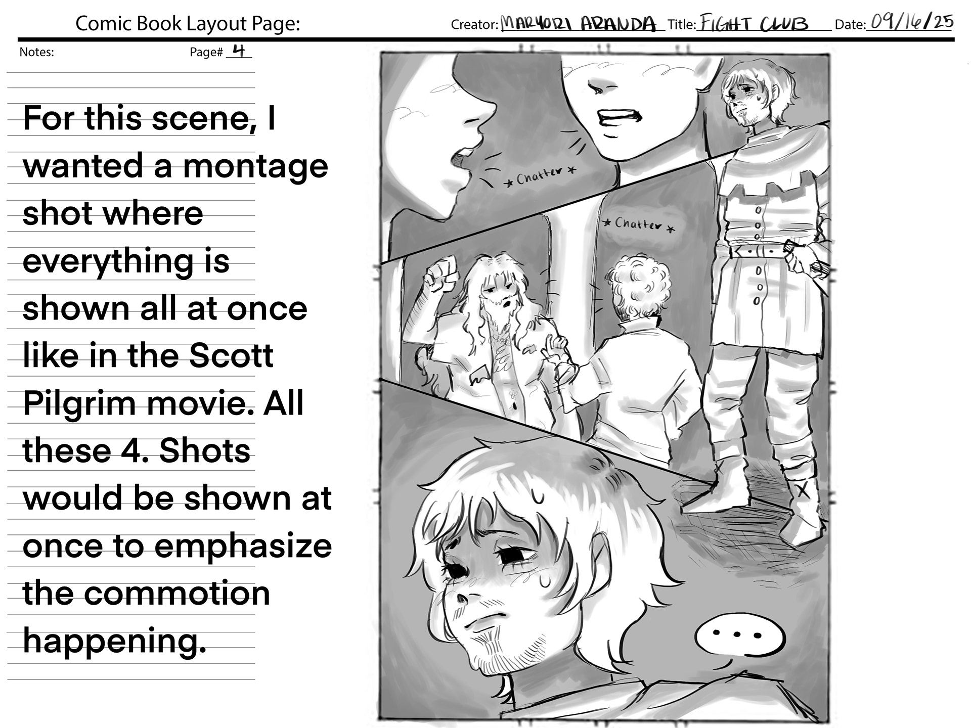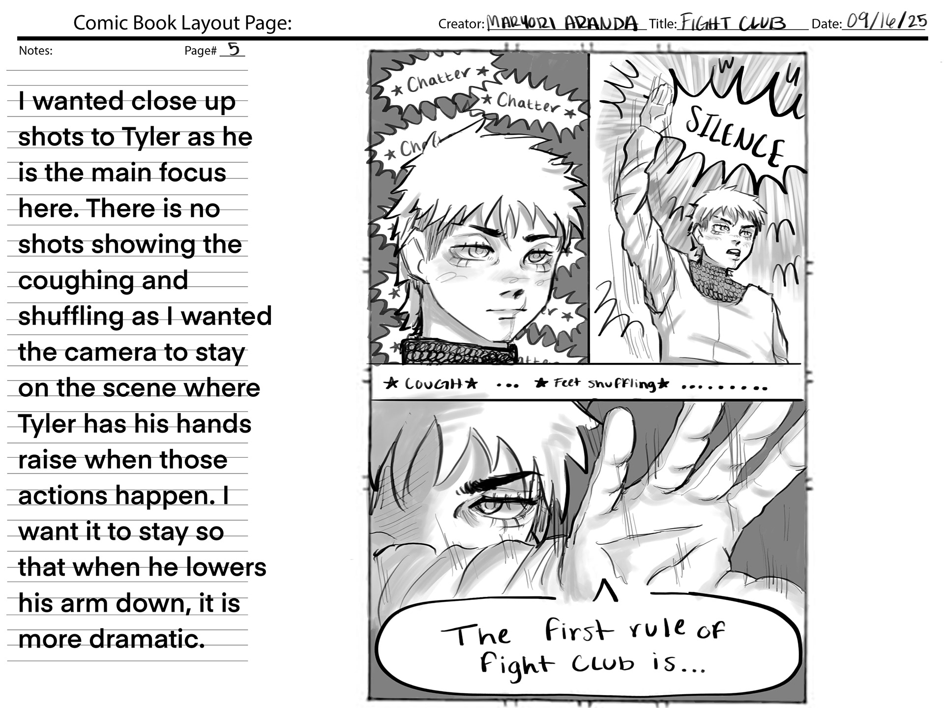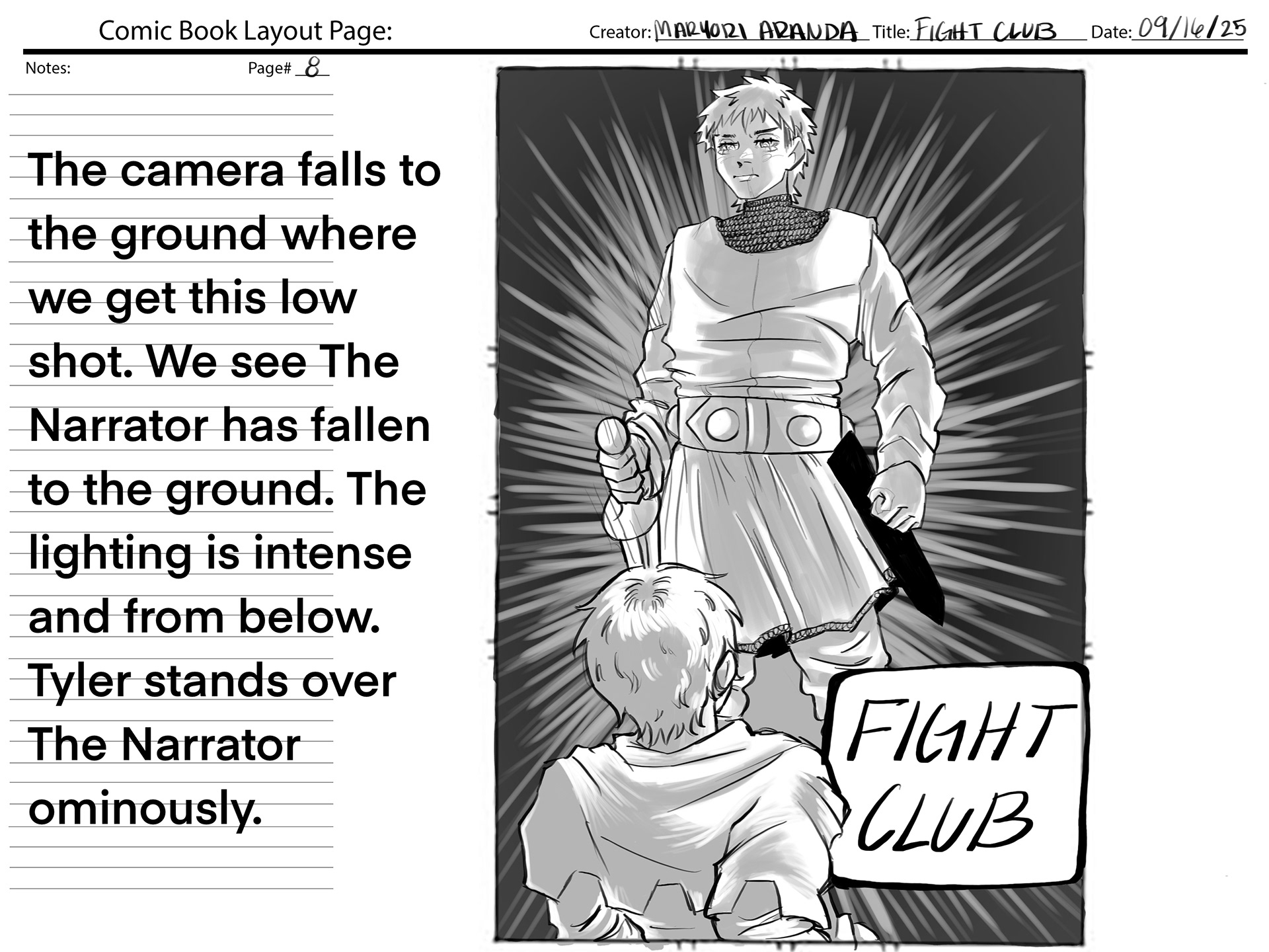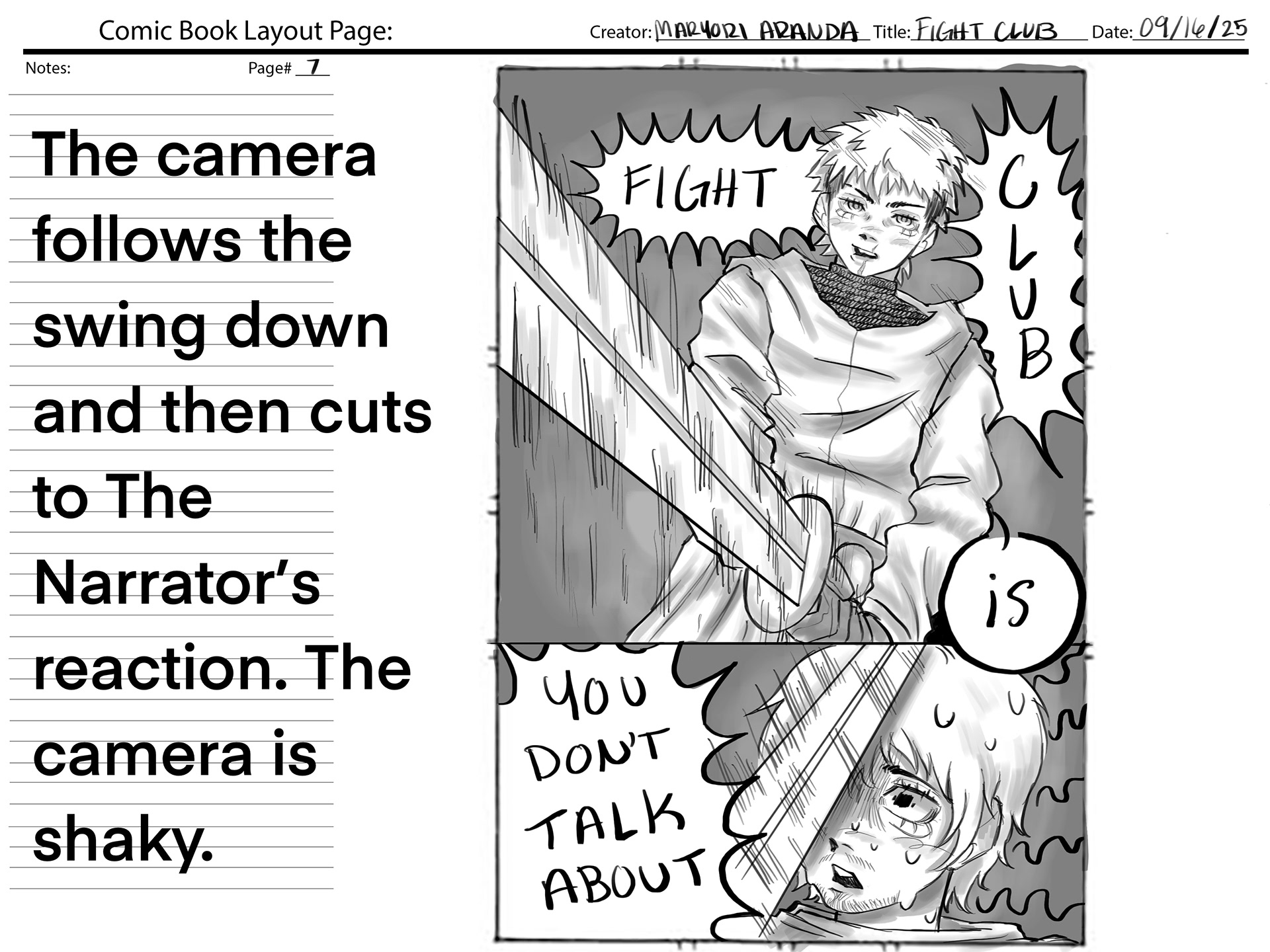 This project required using a section of audio from the movie "Fight Club", and creating our own version of the movie scene. We were also required to create a comic book layout based on the audio.