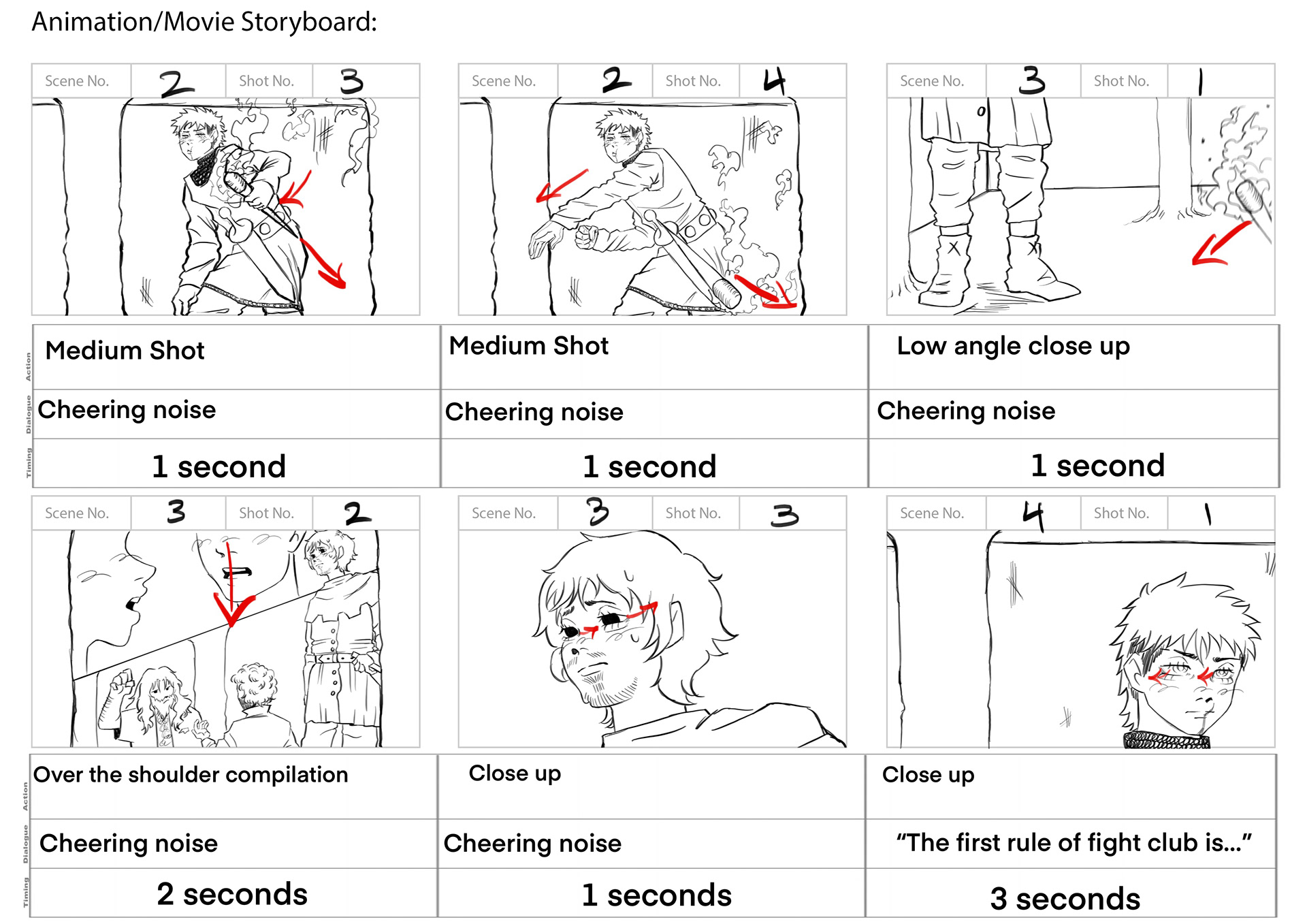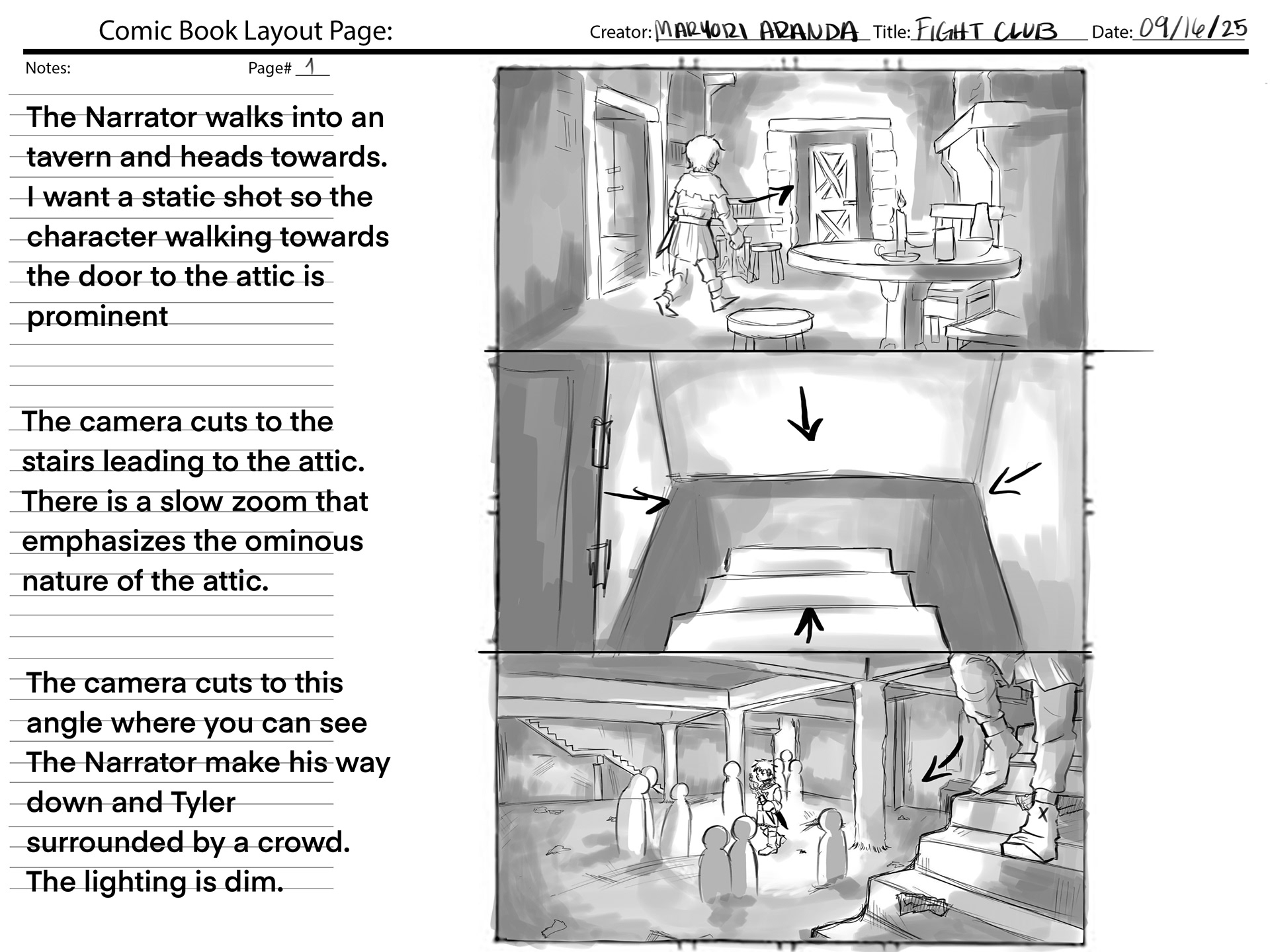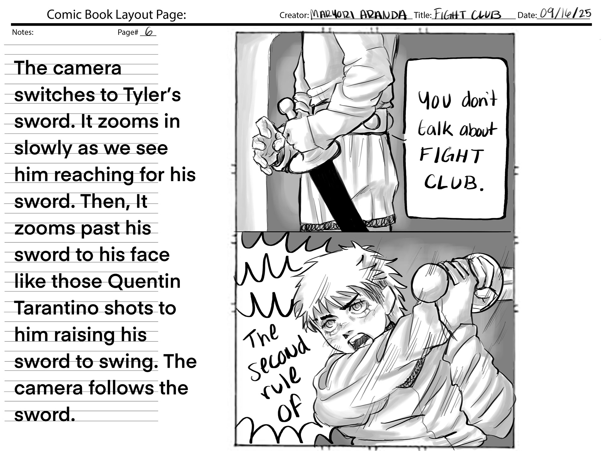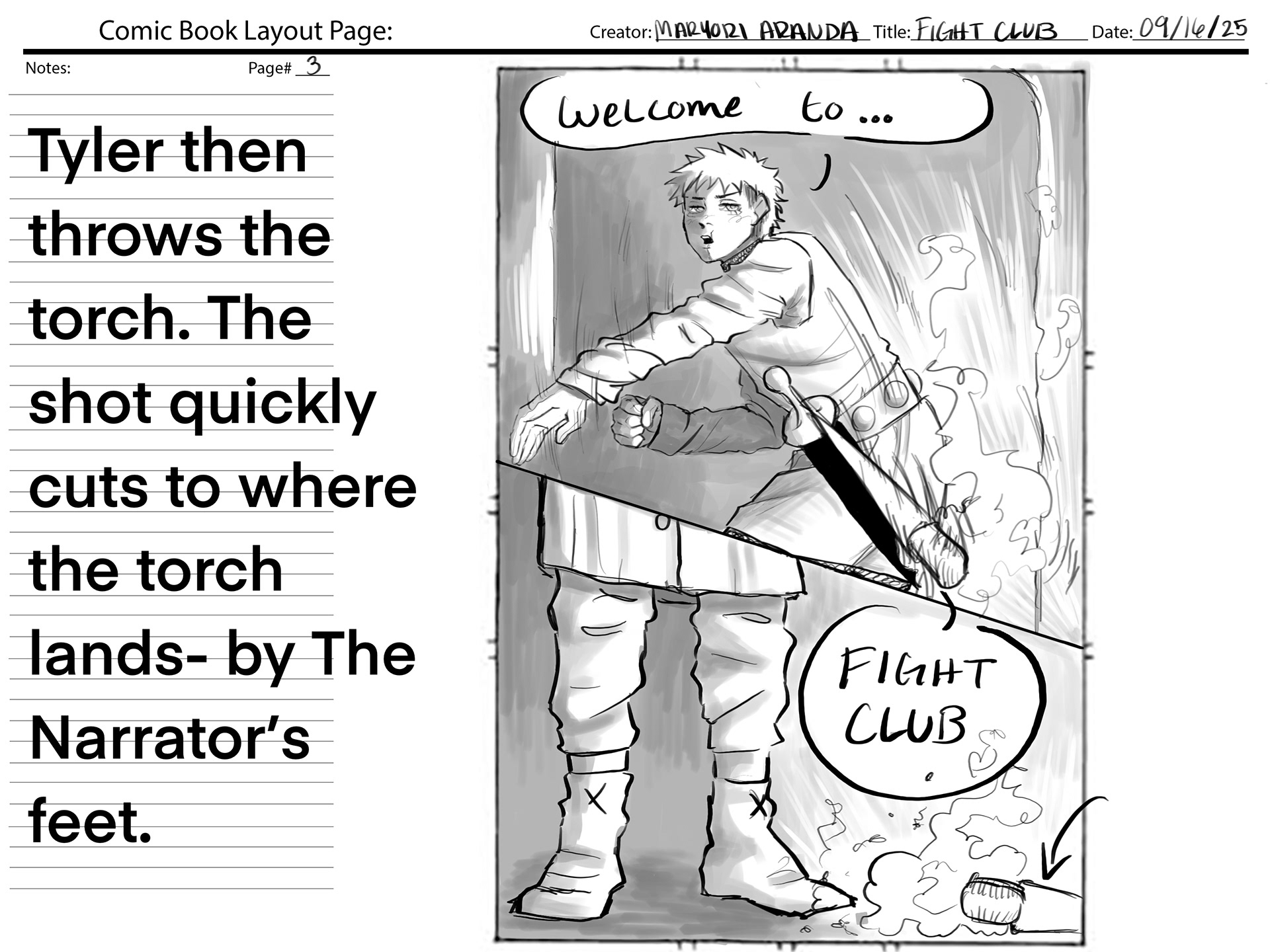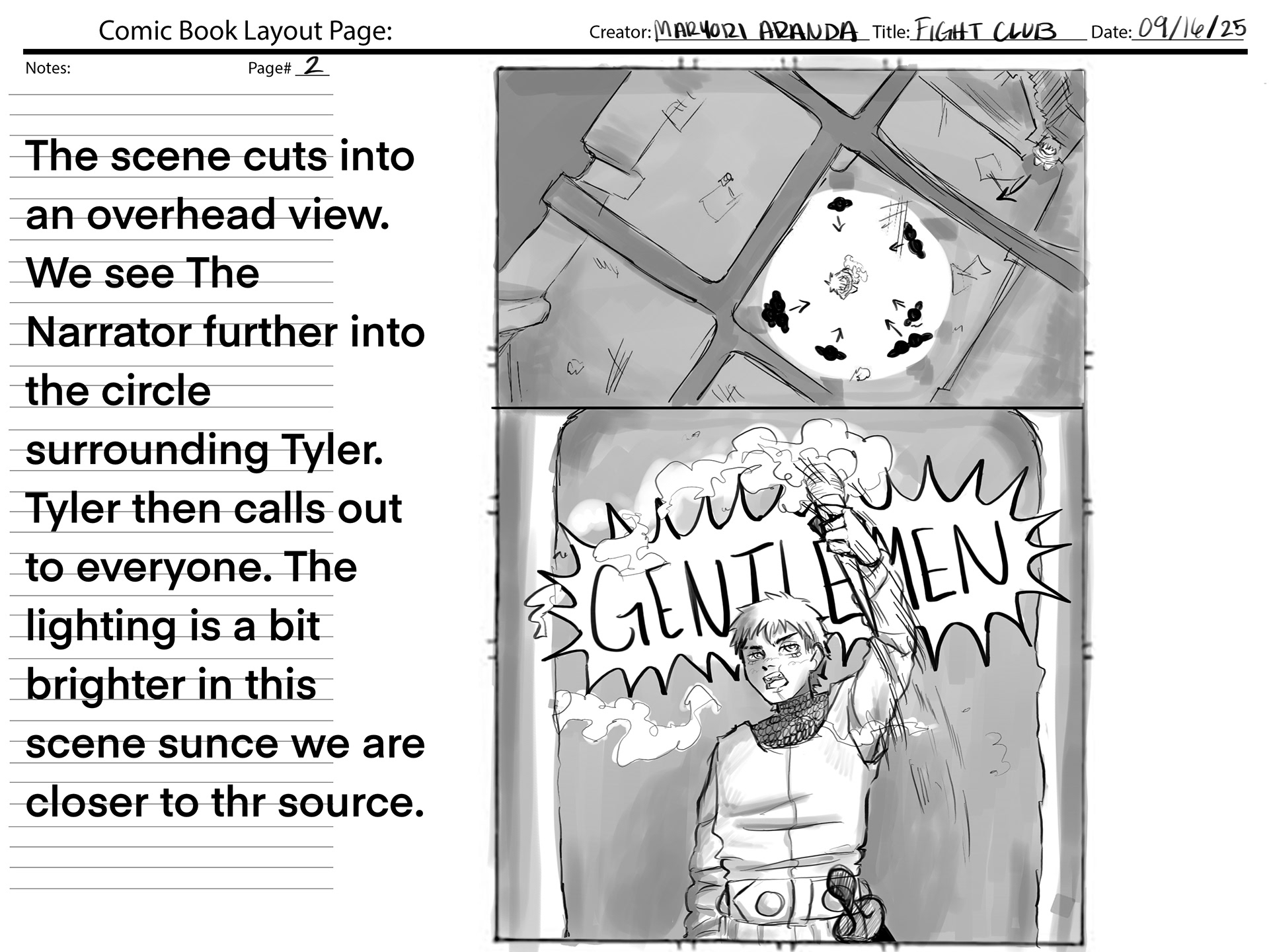 This project required using a section of audio from the movie "Fight Club", and creating our own version of the movie scene. We were also required to create a comic book layout based on the audio.